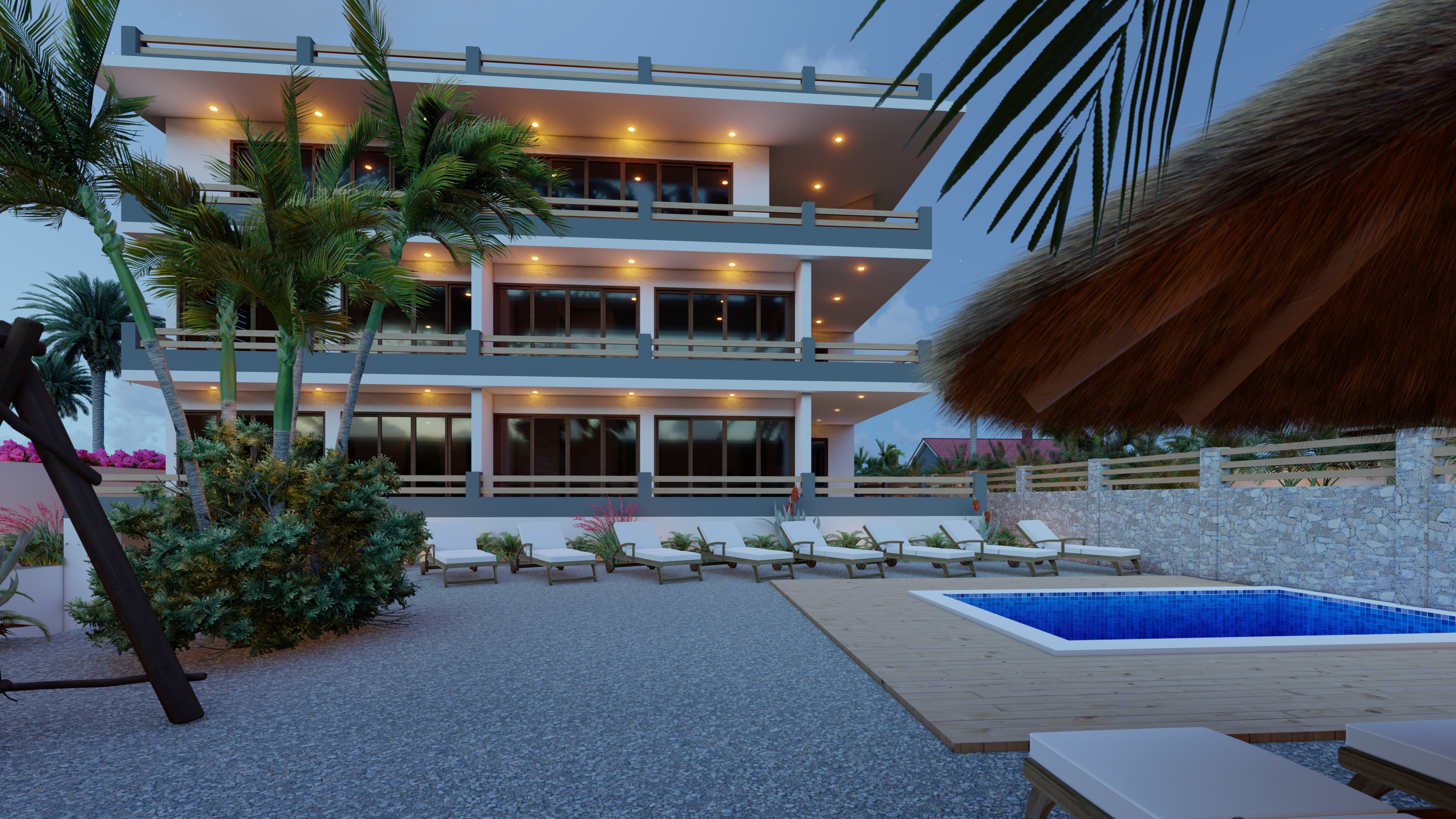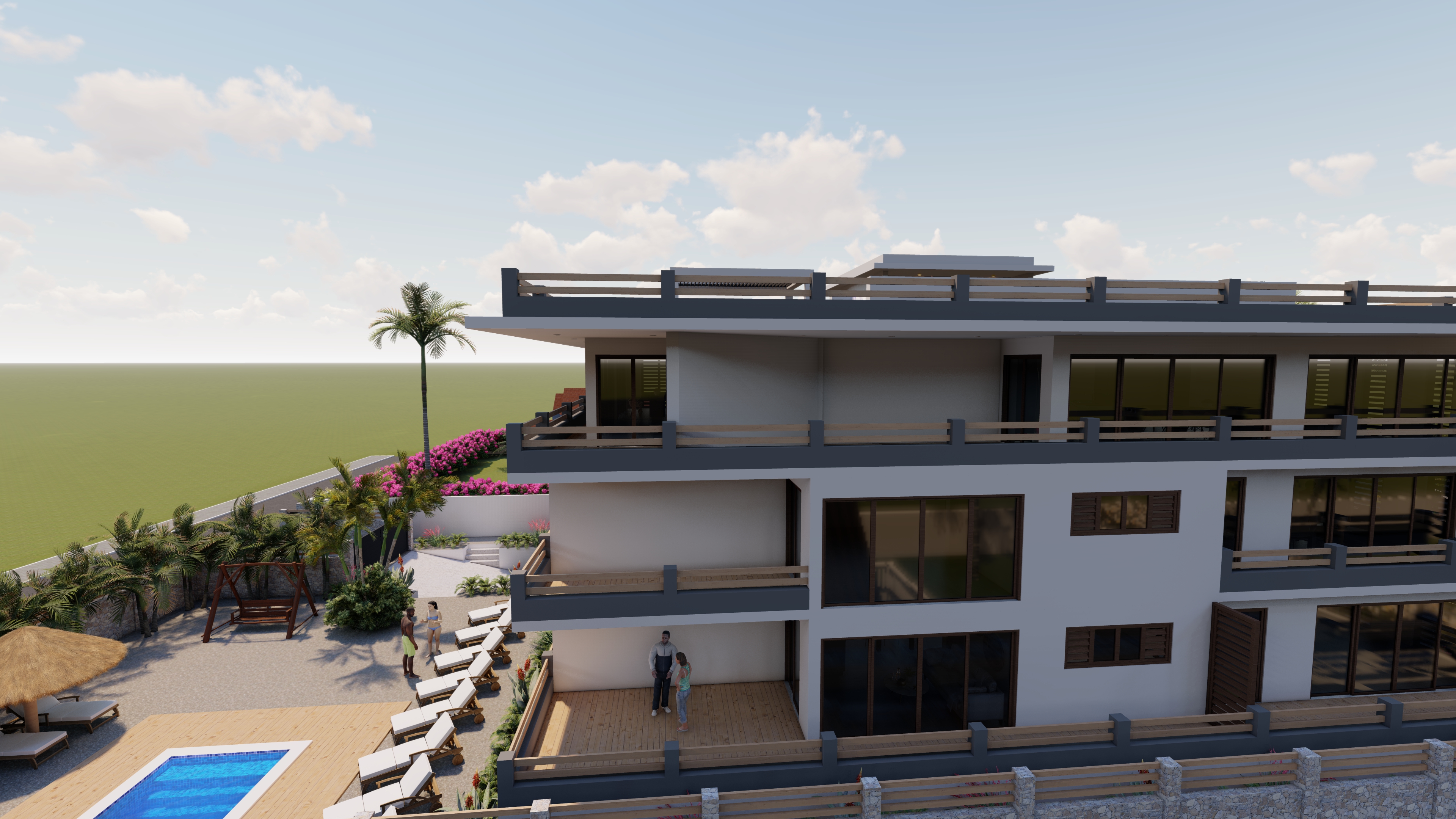 Open Living – Dining – Kitchen, 1 Bedroom, 1 Bathroom, wide Balcony outsidearea, North-West + South-West side, Palmgarden and Pooldeck view, privat dive gear storage, Person lift, optional safe, sun and weather protected parking for one vehicle.