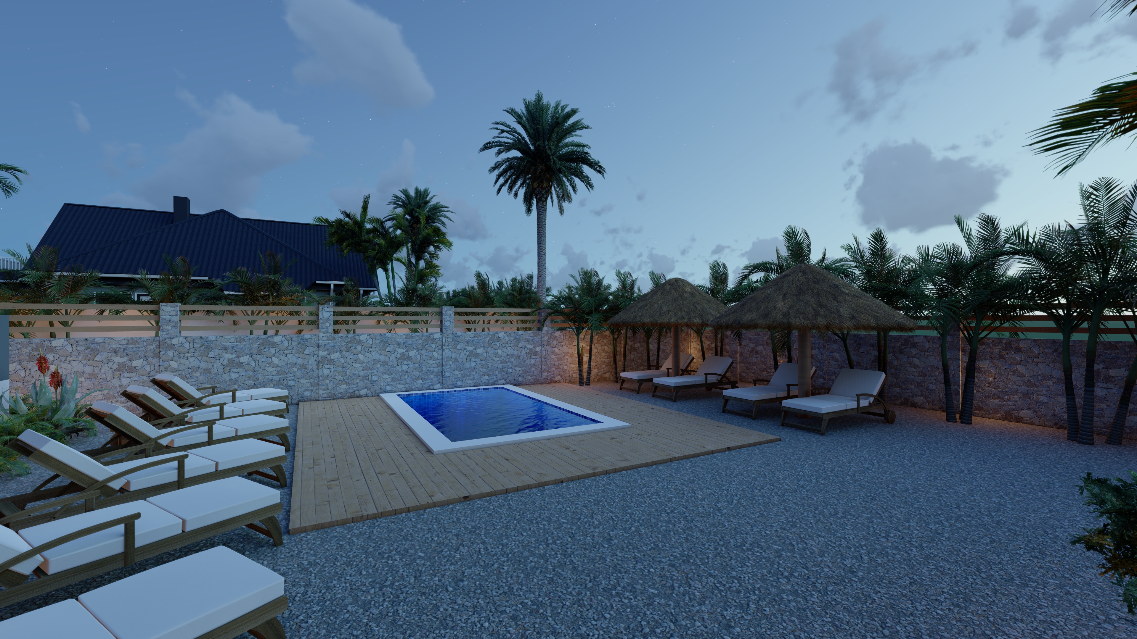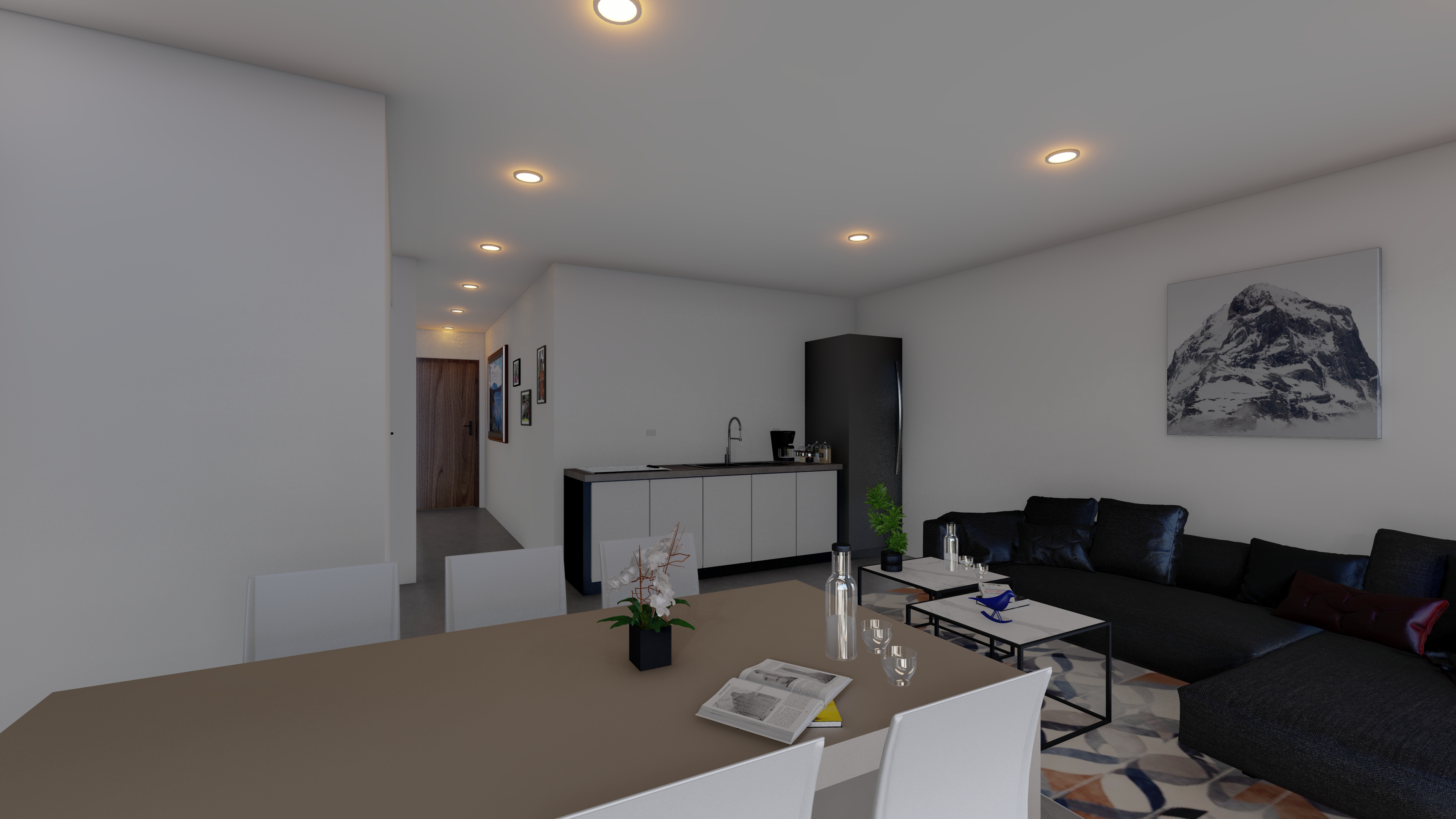 Open Living – Dining – Kitchen, 1 Bedroom, 1 Bathroom, wide Balcony, North-West side, Palmgarden and Pooldeck view, privat dive gear storage, Person lift,