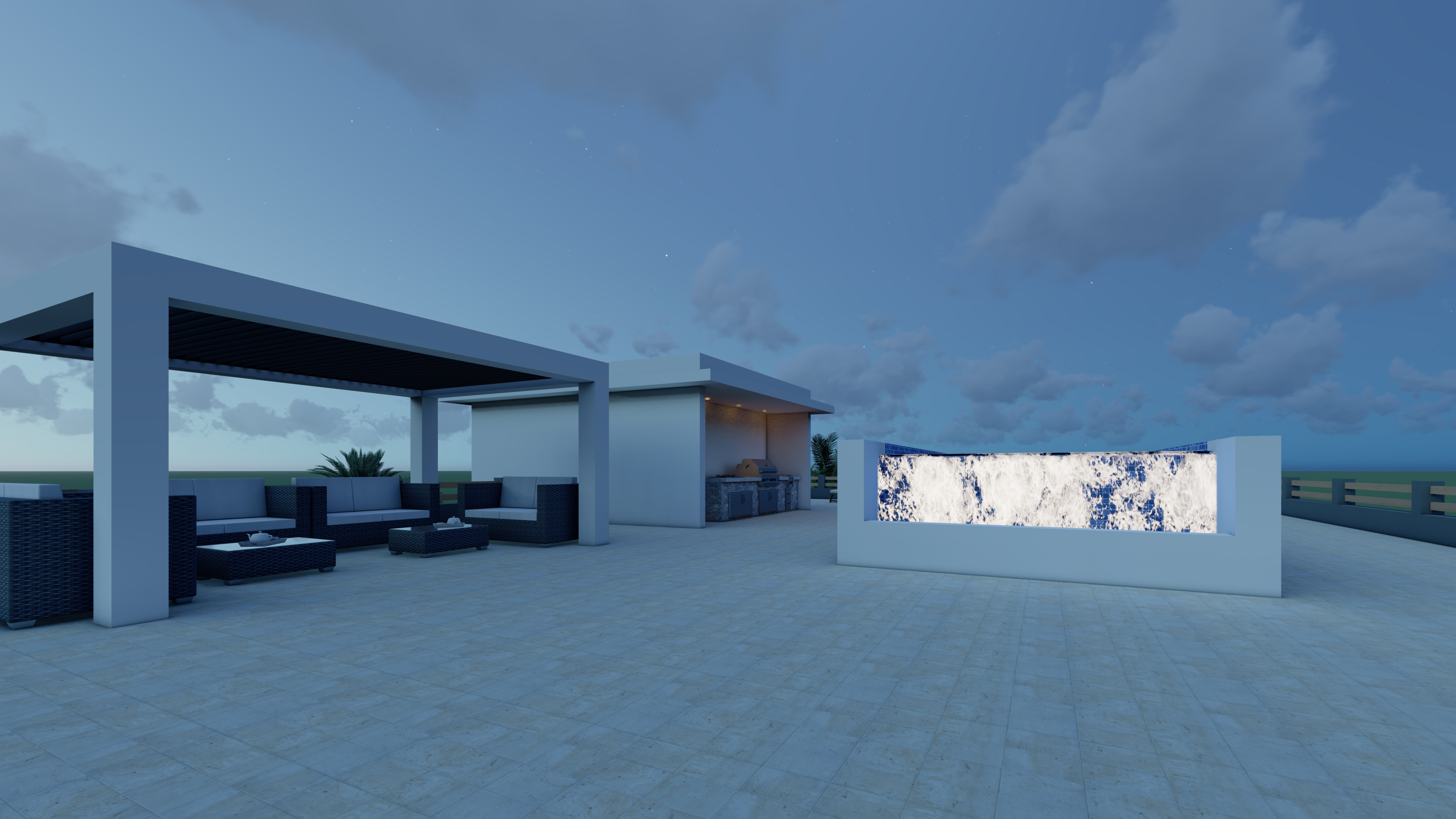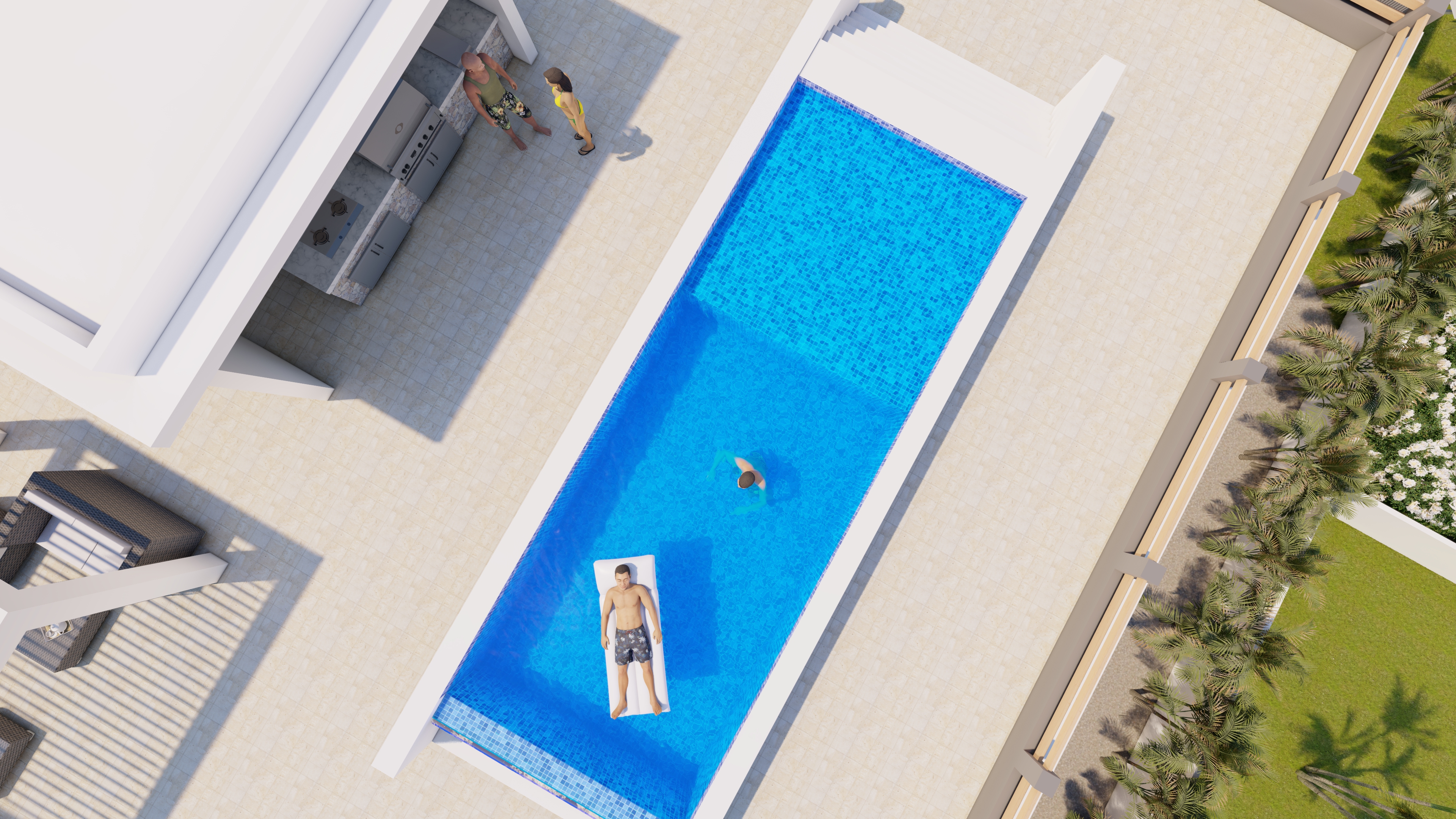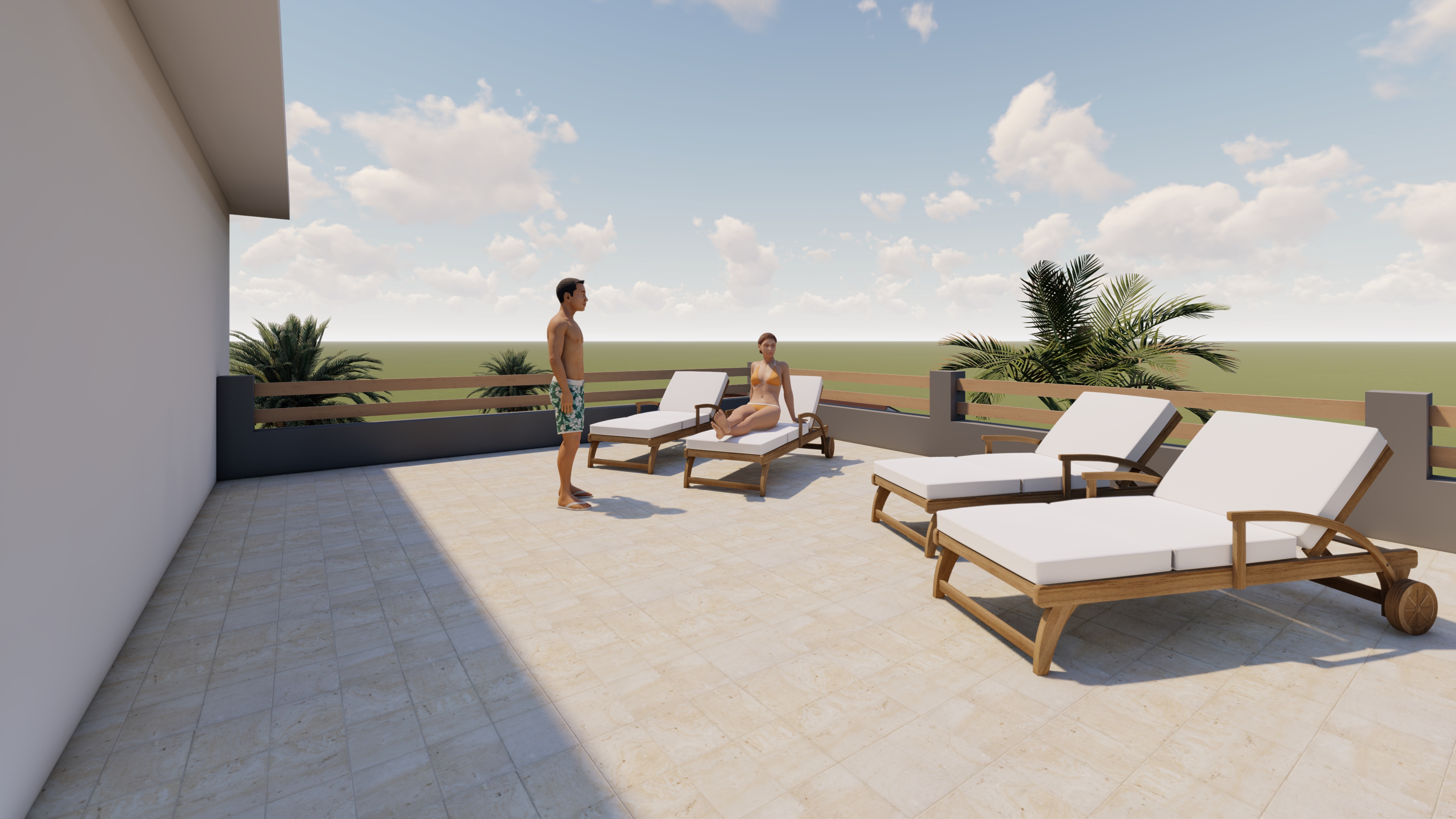 Open Living – Dining – Kitchen, 3 Bedrooms, 3 Bathrooms, Very wide Balcony, North-West + South-West side, fantastic sea view, Palmgarden and Pooldeck in front, huge privat Roofterrace with 360° view, privat dive gear storage, Person lift, optional safe, sun and weather protected parking for one vehicle.