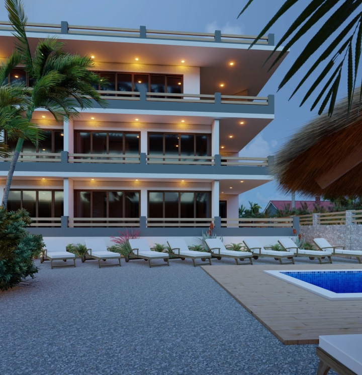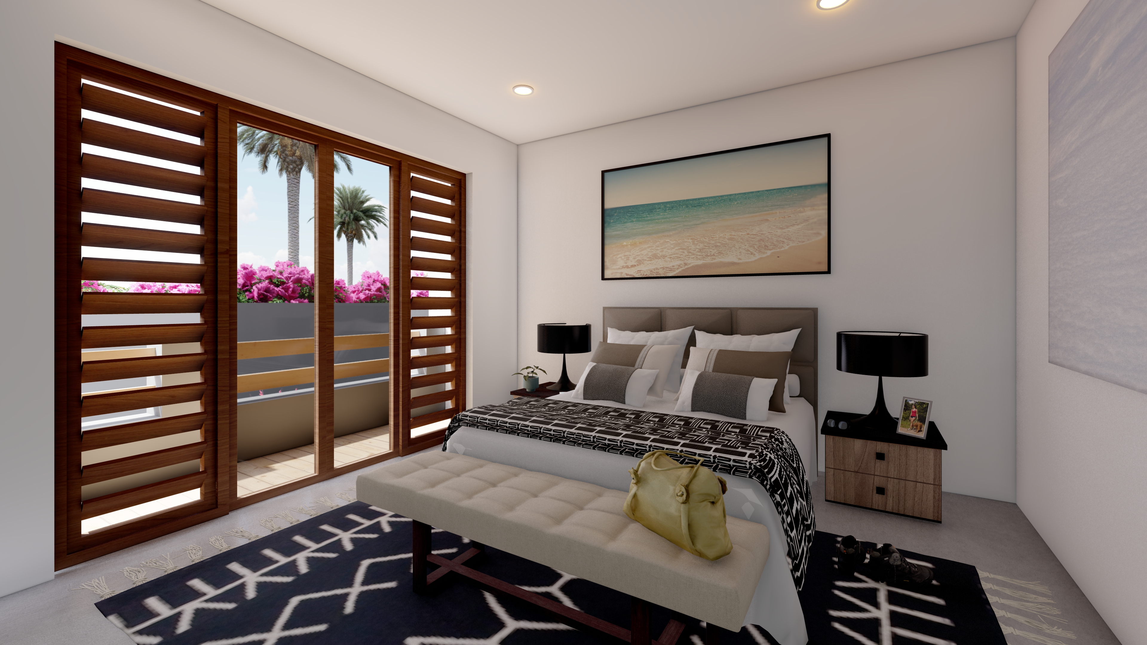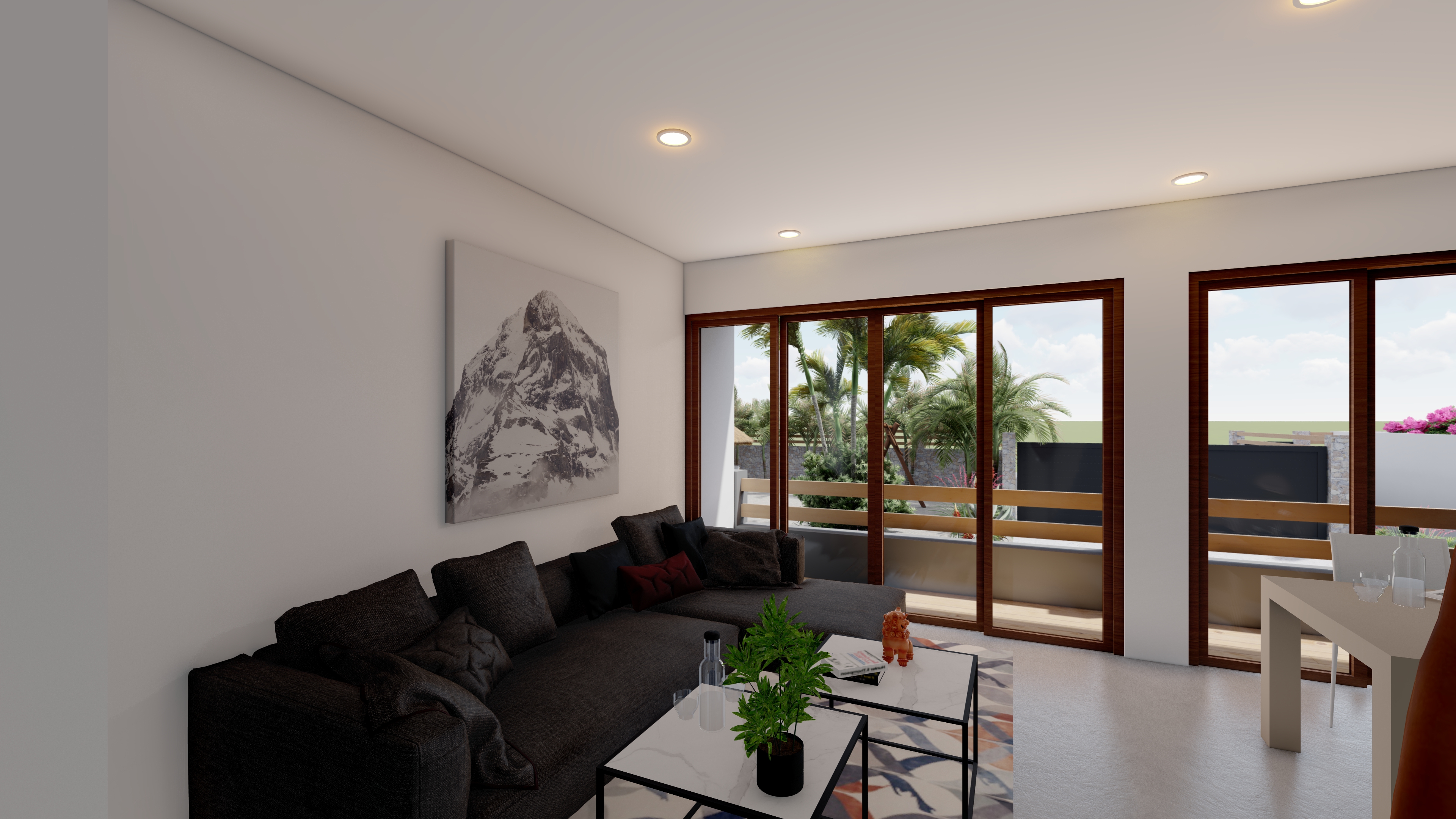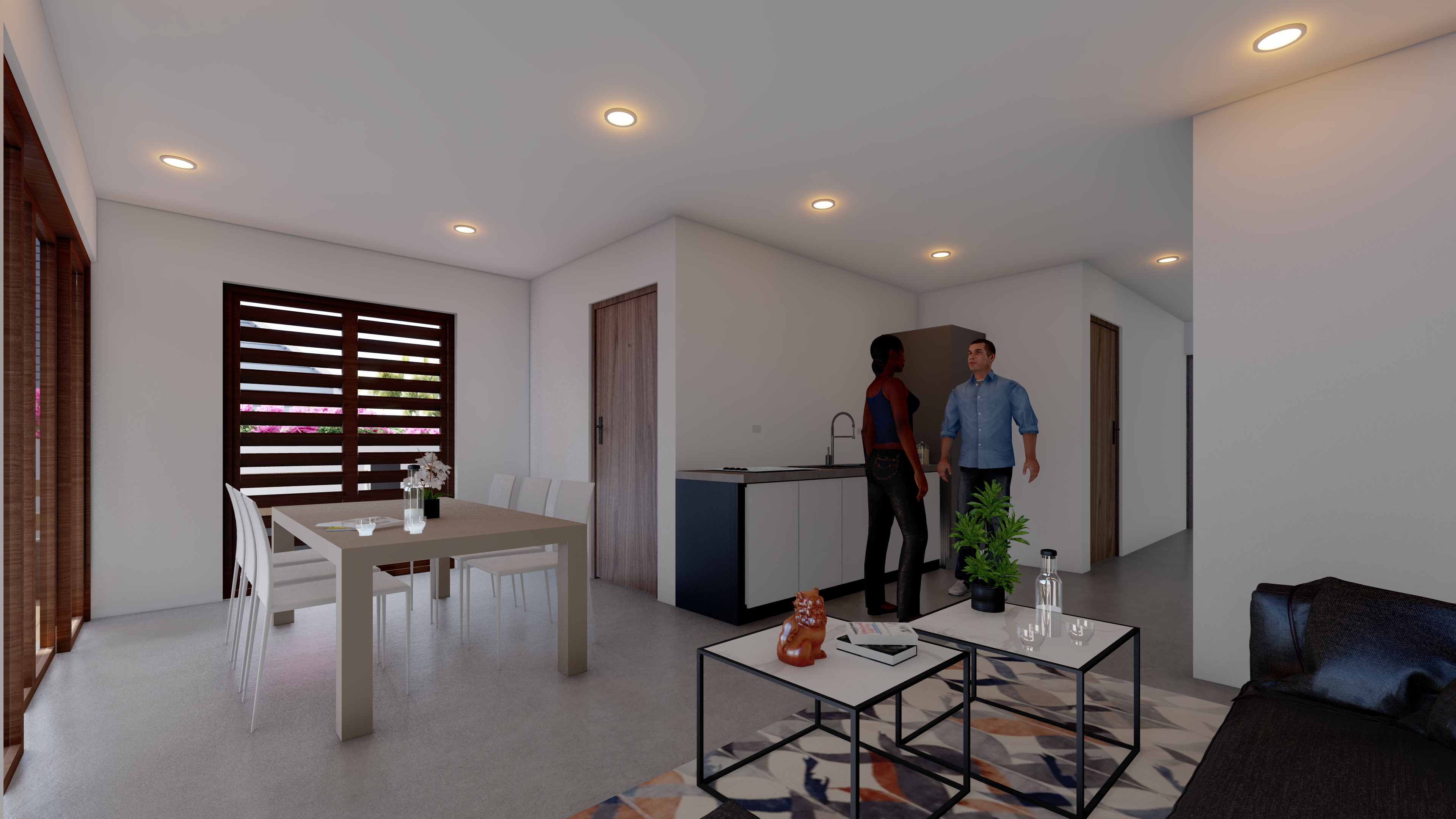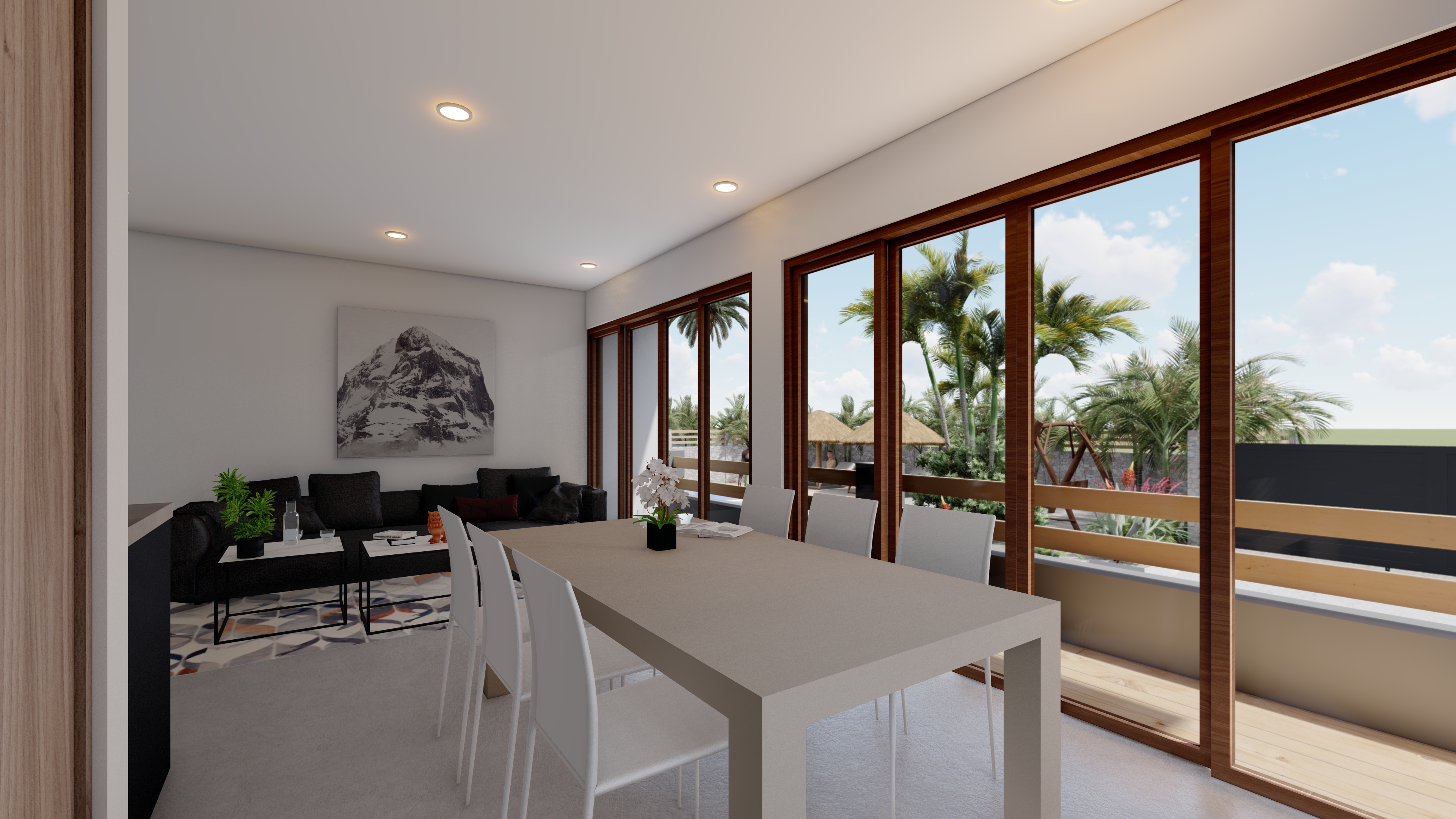 Open Living – Dining – Kitchen, 1 Bedroom, 1 Bathroom, Balcony/ Terrace North-East + North-West side, Palm garden and Pool deck view, private dive gear storage, Person lift, optional safe, sun and weather protected parking for one vehicle.